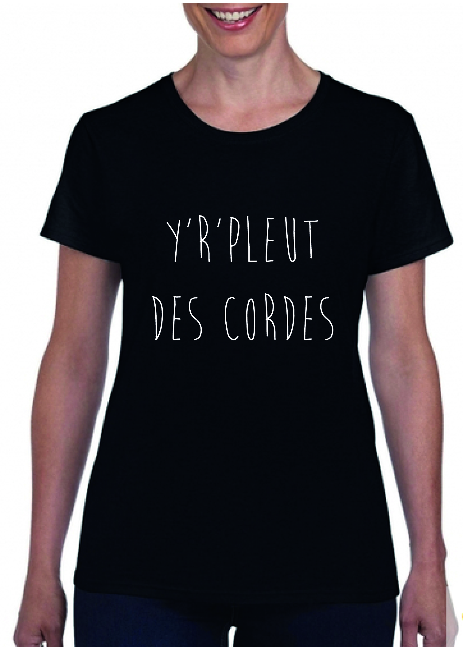 T-shirt Femme noir avec expression normande » Y’r’pleut des cordes «